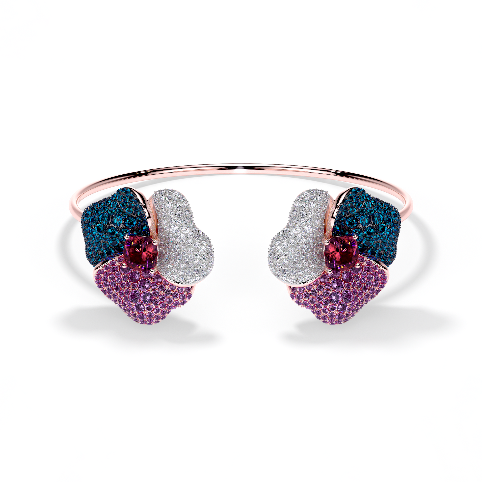 Bloom Large Flower Amethyst & Blue Diamond & White Diamond And Rhodolite Garnet Cushion Center In Pink Gold bangle