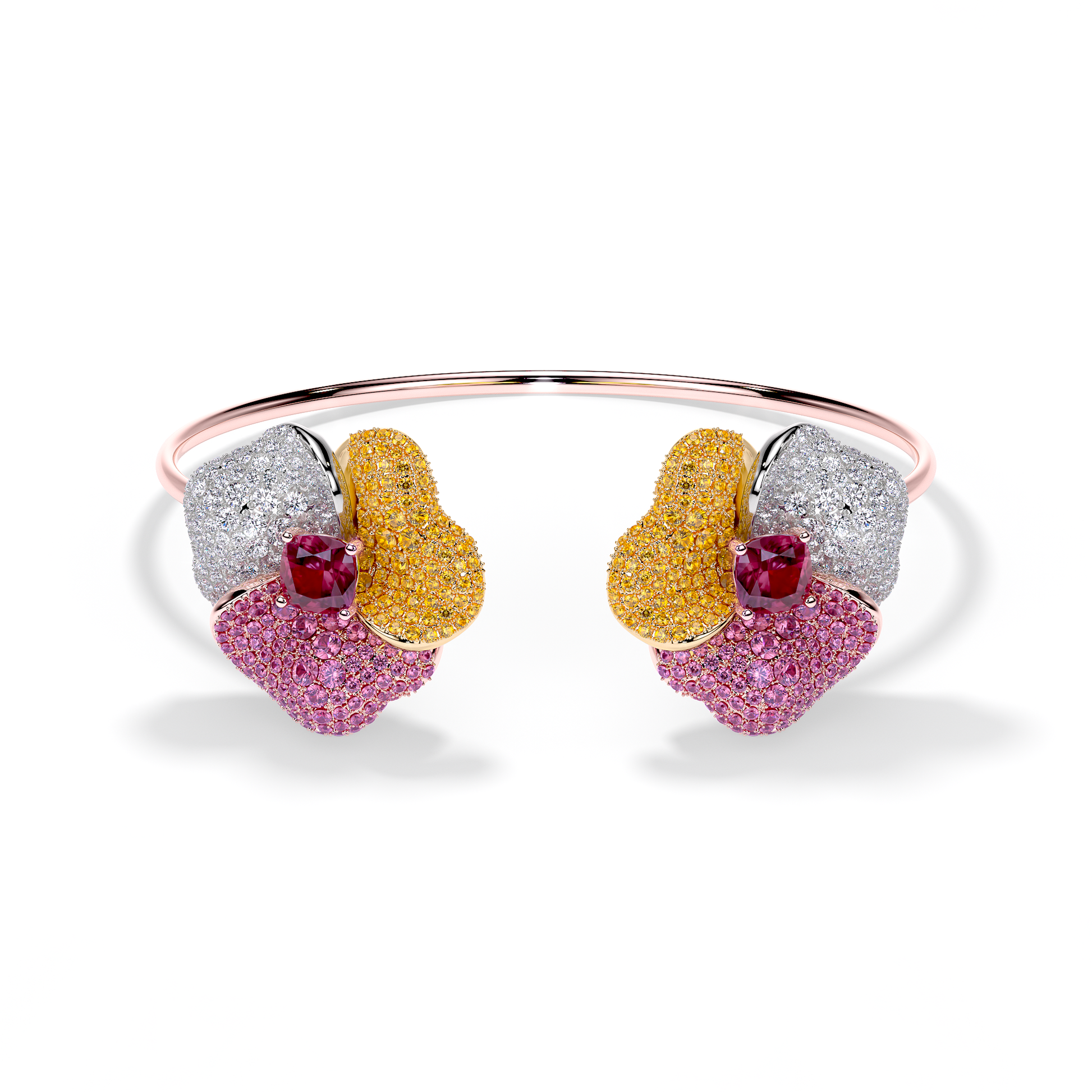 Bloom Large Flower Dark Pink Sapphire & Orange Sapphire & White Diamond And Rhodolite Cushion Center In Pink Gold bangles