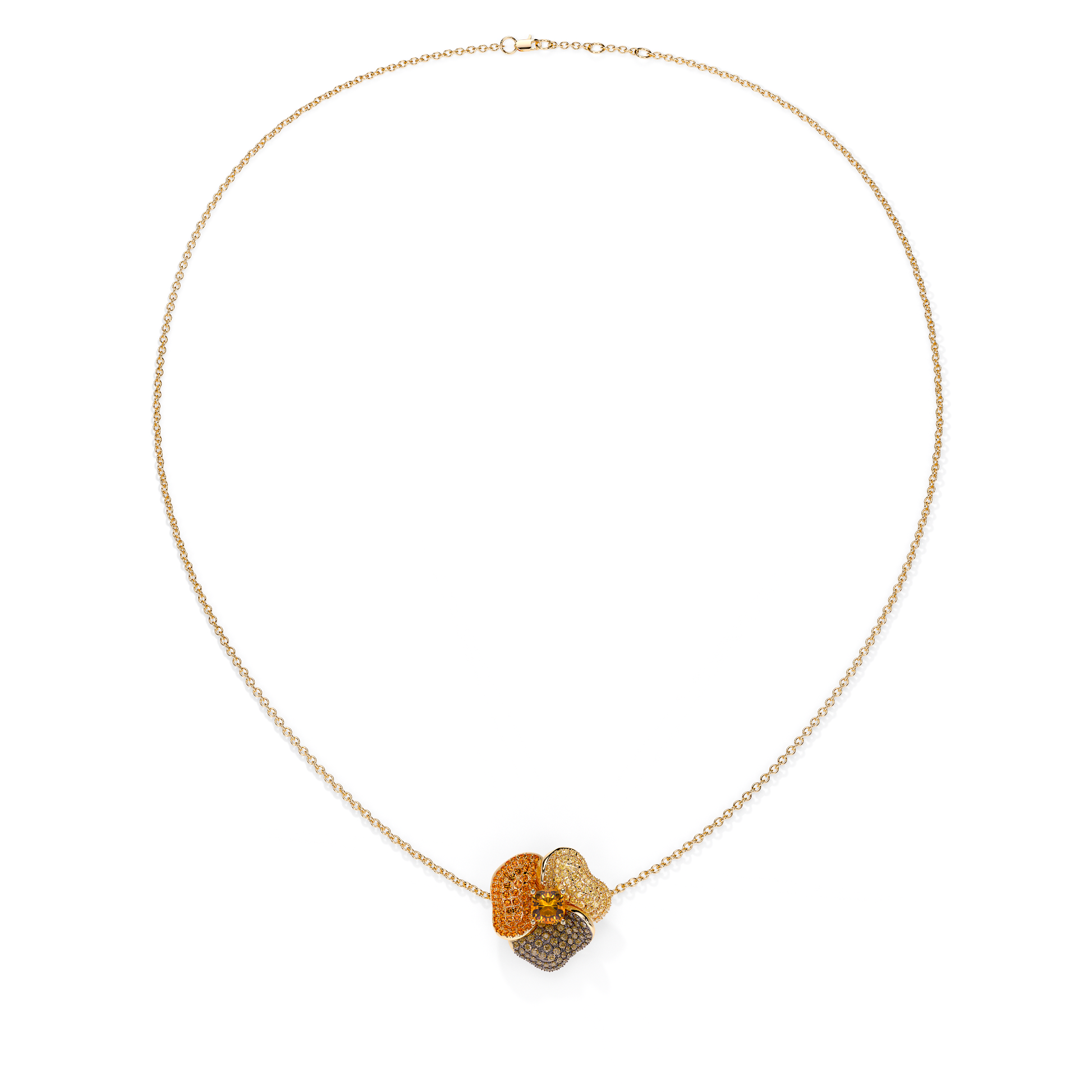 Bloom Medium Flower In Brown Diamond & Orange Sapphire And Citrine Cushion Center In Yellow Gold necklace