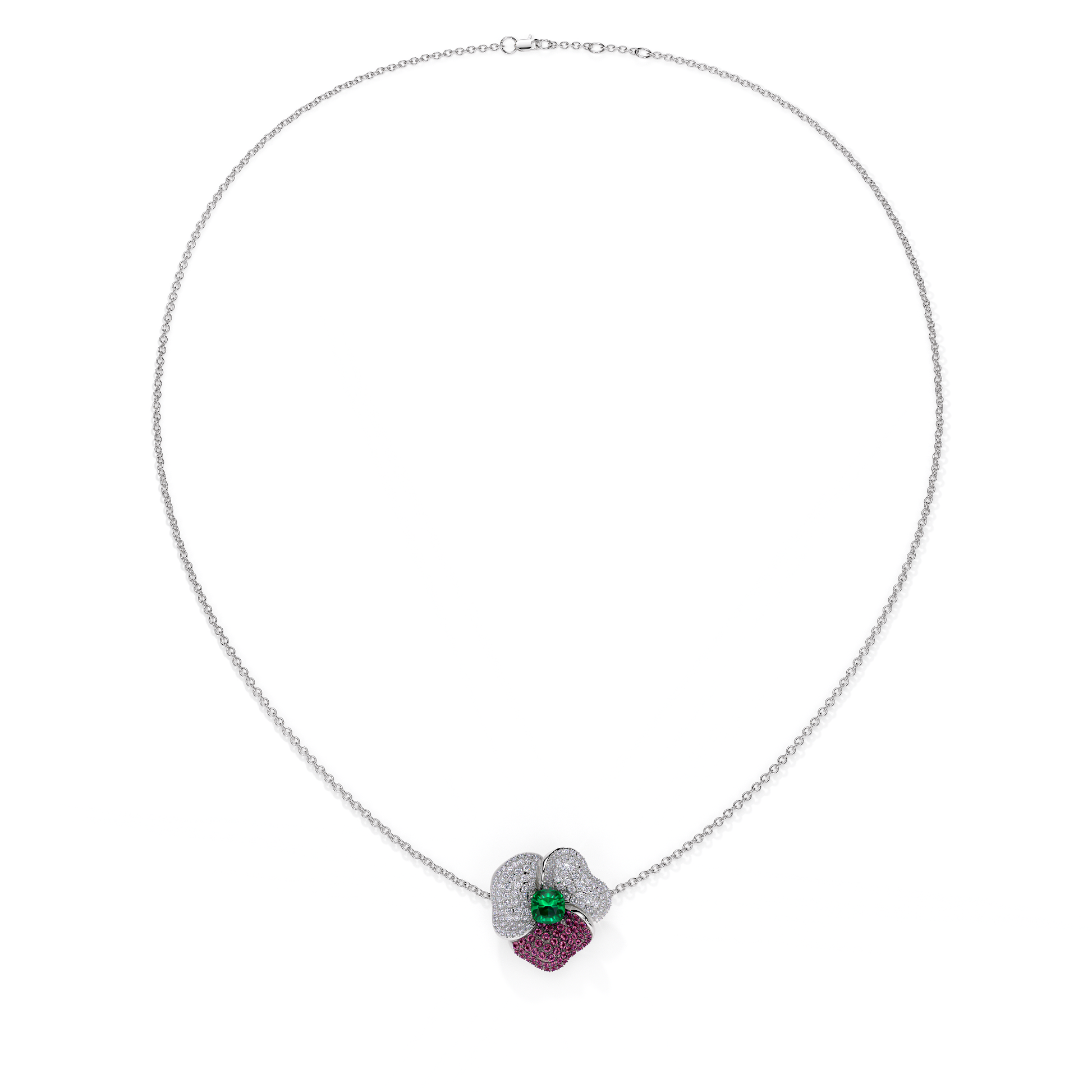 BLOOM MEDIUM FLOWER IN DARK PINK SAPPHIRE, WHITE DIAMONDS & Tsavorite CUSHION CENTRE STONE ON 18K WHITE GOLD NECKLACE