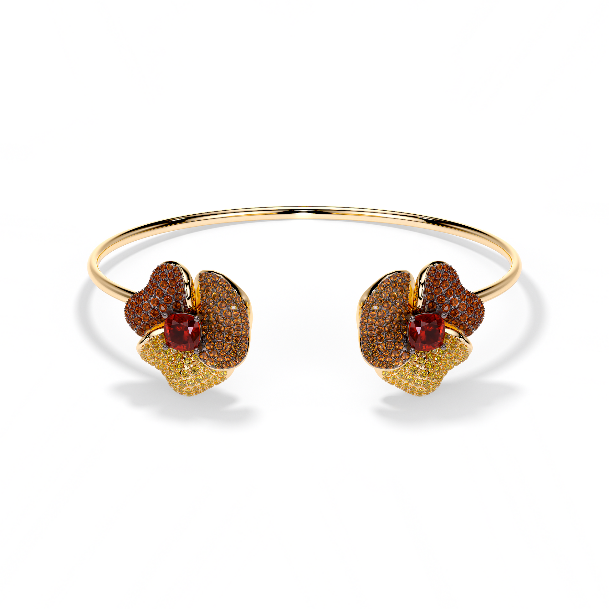 Bloom Medium Flower In Yellow & Orange Sapphire And Red Garnet Cushion Center In Yellow Gold bangle