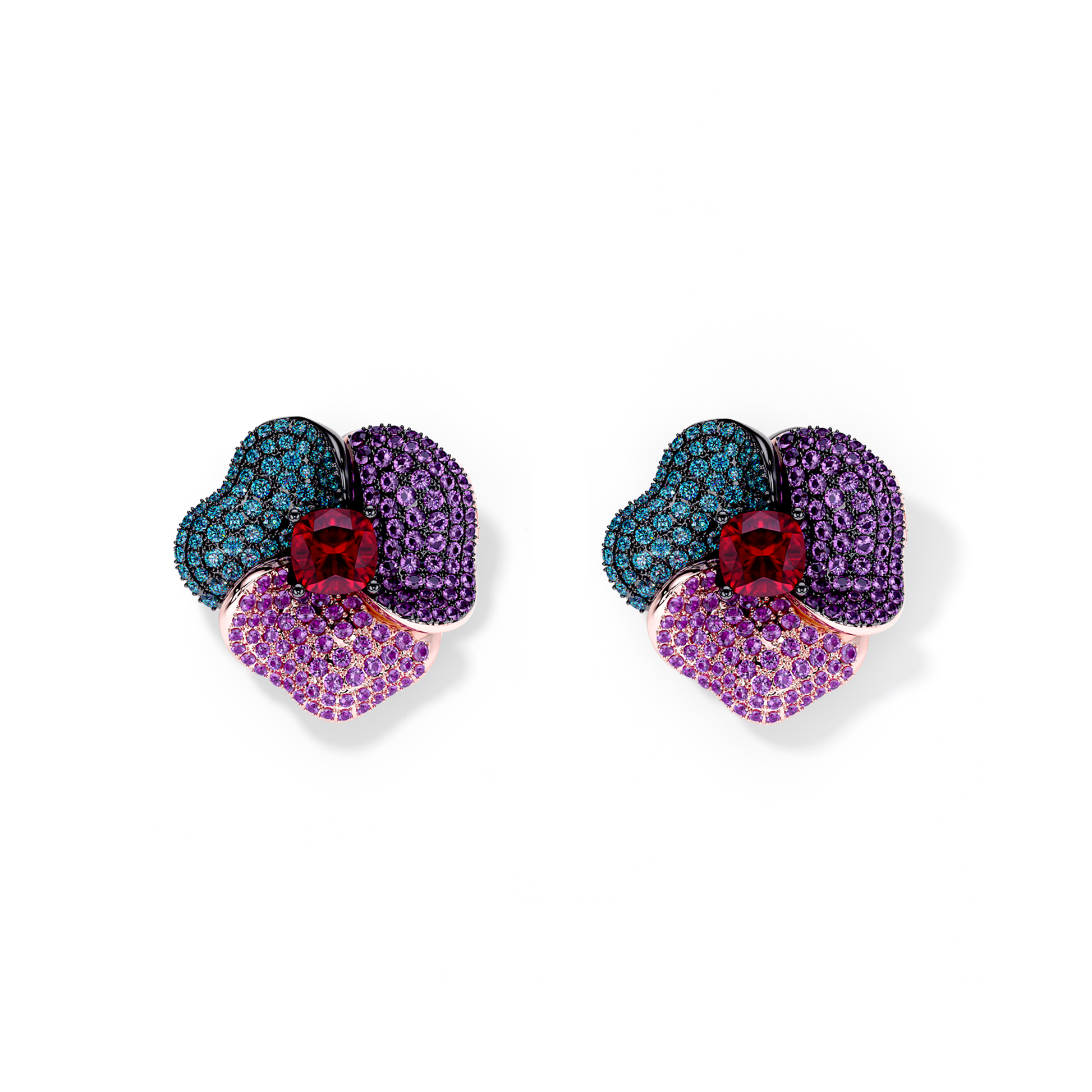 Bloom Medium Flower Treated Blue Diamond &Amethyst And Red Gernet Cushion Center In Pink Gold earrings