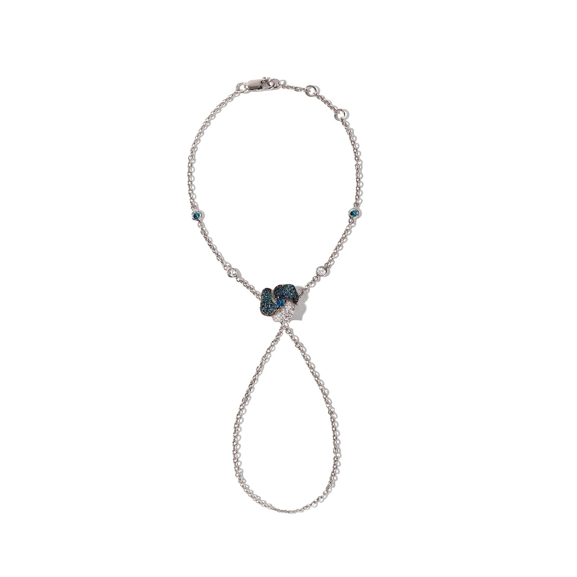 Bloom Mini Flower Hand Bracelet in White Diamonds , Blue diamonds and London Blue Topaz Center Stone in 18K White Gold (White Sapphire and London blue topaz on the Chain)