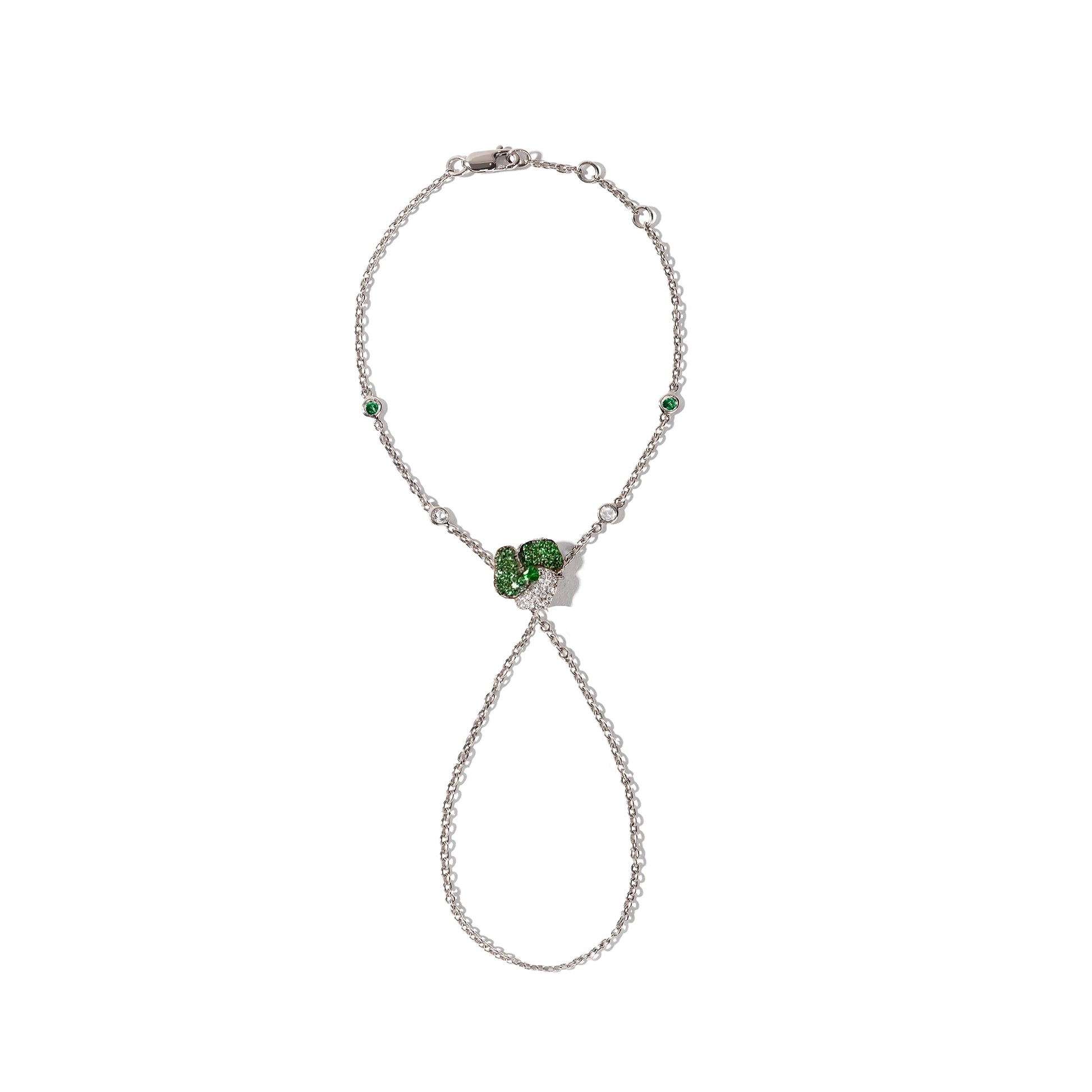 Bloom Mini Flower Hand Bracelet in White Diamonds ,Tsavorite and Tsavorite Center Stone in 18K White Gold (Tsavorite and White Sapphire on the Chain)