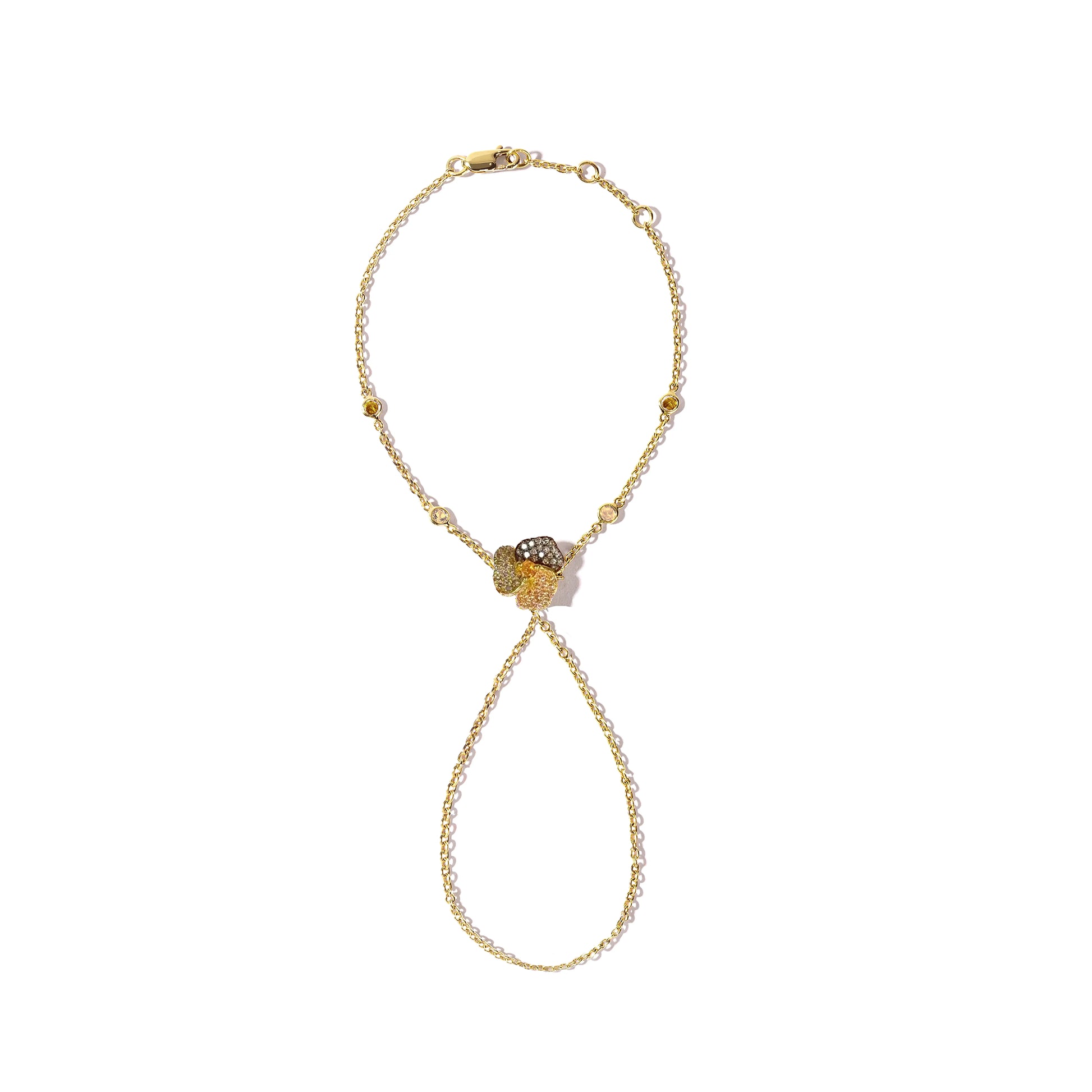 Bloom Mini Flower Hand Bracelet in Brown Diamonds, Orange Sapphire and Citrine Center Stone in 18K Yellow Gold ( Brown diamonds and Citrine on the Chain)