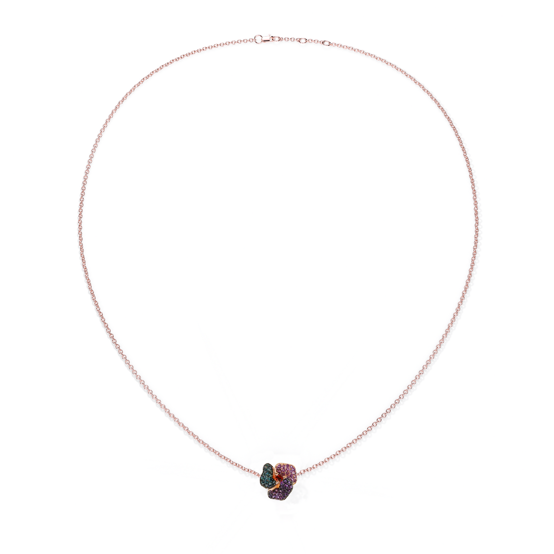 Bloom Mini Flower Treated Blue Diamond &Amethyst And Red Gernet Cushion Center In Pink Gold necklace