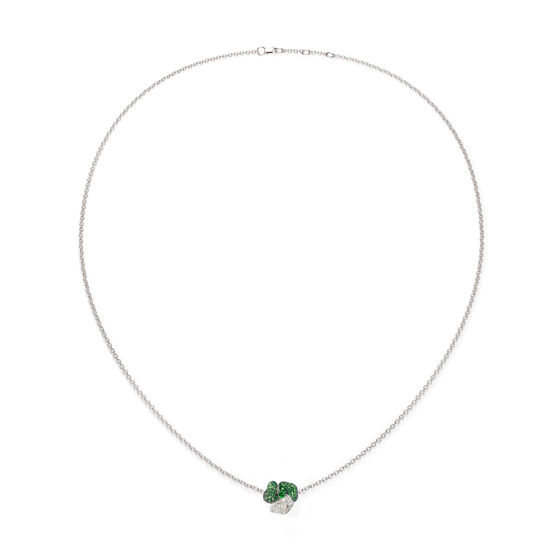 Bloom Mini Flower In Dark Green &Light Green Tsavorite And Tsavorite Cushion Center In White Gold necklace