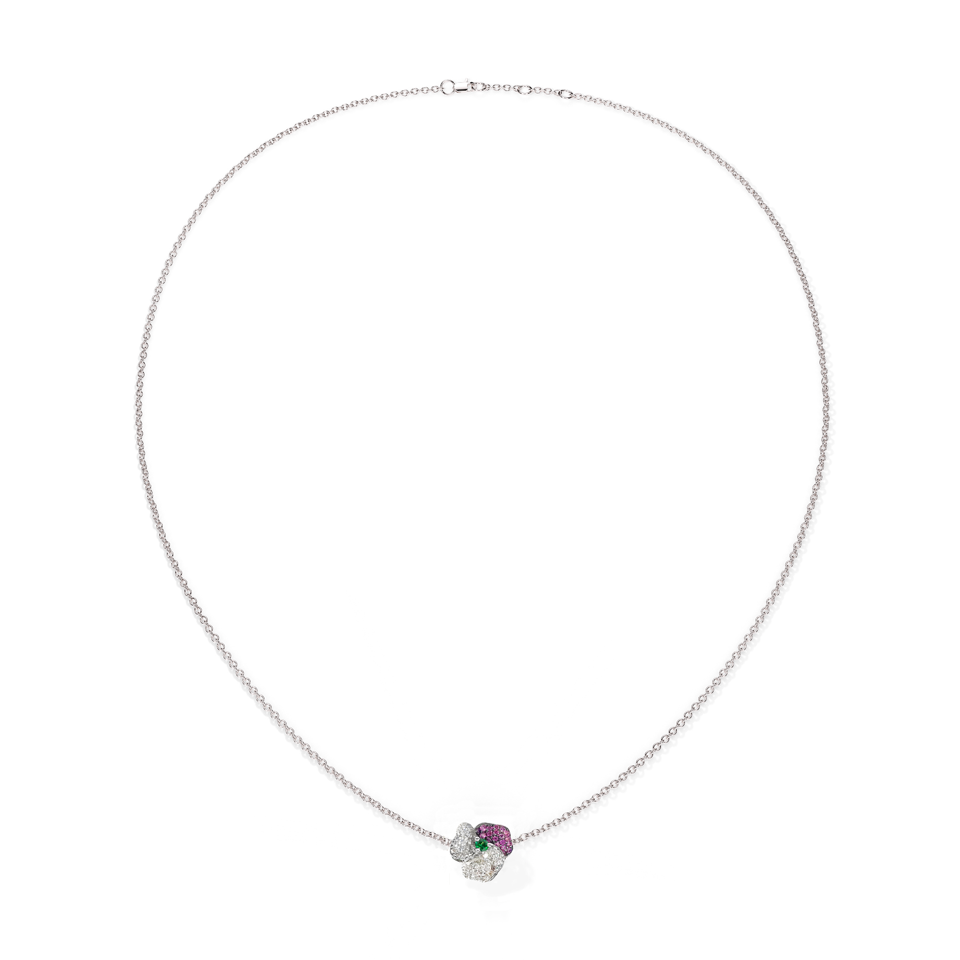 Bloom Mini Flower In Pink Sapphire & White Diamond And Tsavorite Cushion Center In White Gold necklace