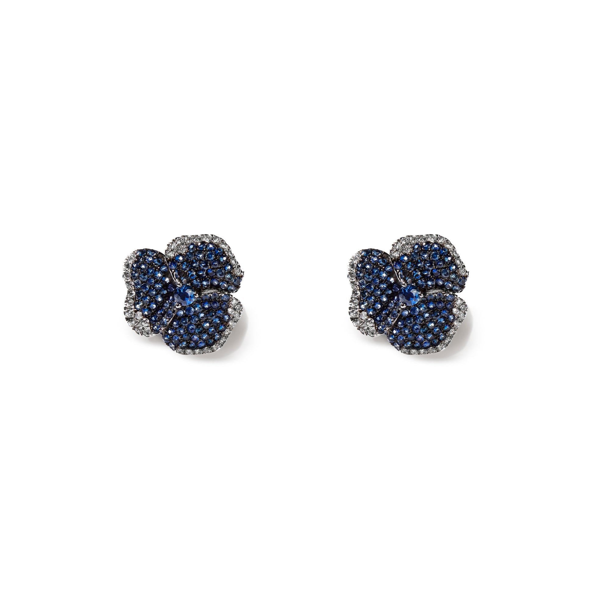 Crafted in 18K White Gold, these elegant earrings are encrusted with Blue Sapphire stones. Part of our Bloom Collection, this pansy flower-inspired piece was designed to remind you of the infinite possibilities within. You can wear it with its matching ring and bracelet.