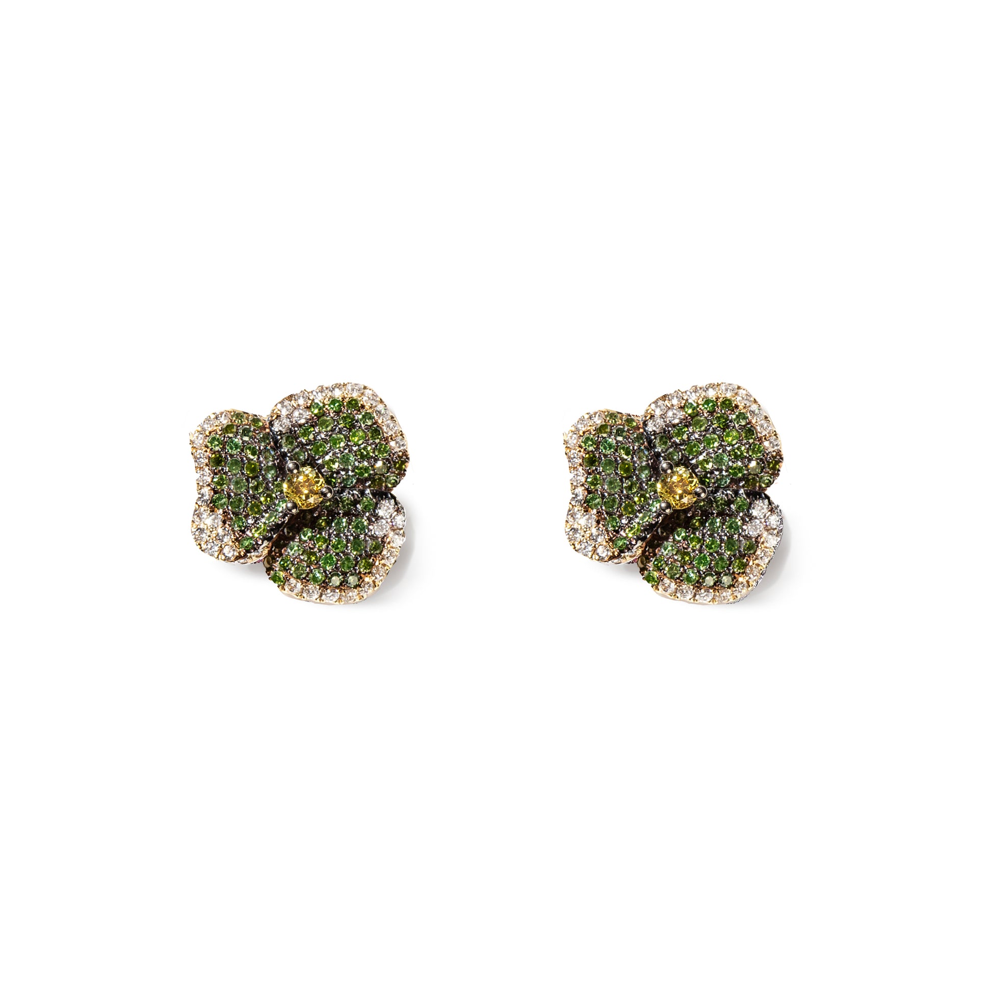 Crafted in 18K Yellow Gold, these elegant earrings are encrusted with Green Diamonds and Yellow Sapphire as centre stones. Part of our Bloom Collection, this pansy flower-inspired piece was designed to remind you of the infinite possibilities. You can wear it with its matching ring and bracelet.