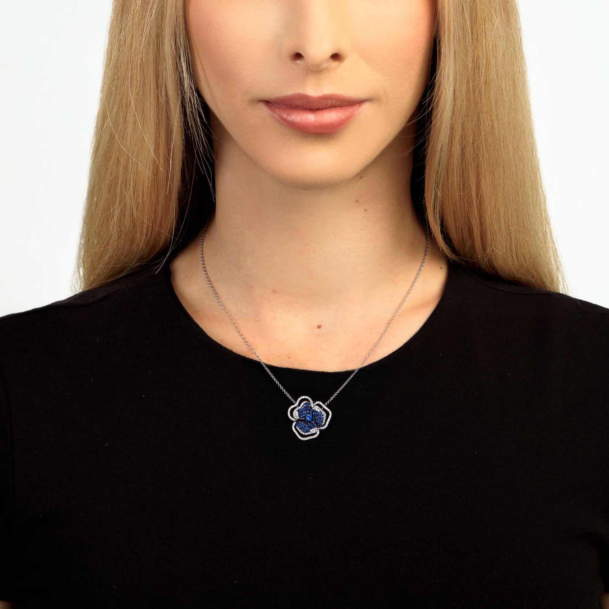 Crafted in 18K white gold, this necklace features a blue flower encrusted in pave diamonds and Blue Sapphires with a Blue Sapphire centre stone.