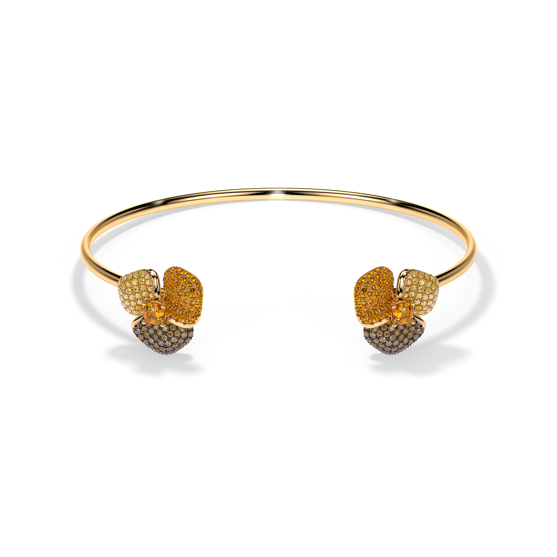 Bloom Small Flower In Brown Diamond & Orange Sapphire And Citrine Cushion Center In Yellow Gold bangle
