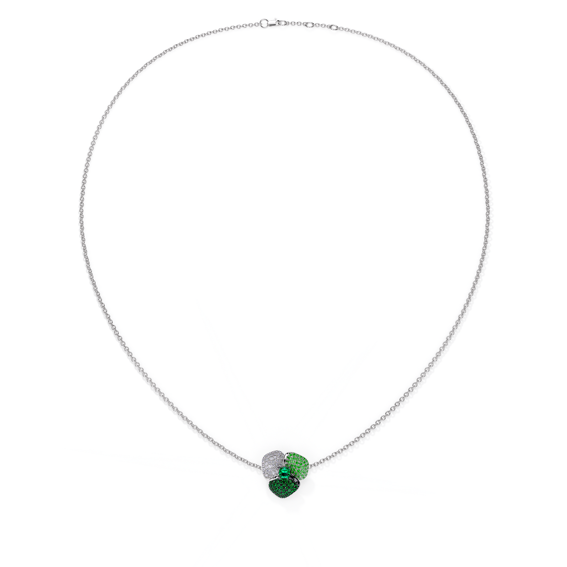 Bloom Small Flower In Dark Green &Light Green Tsavorite And Tsavorite Cushion Center In White Gold necklace
