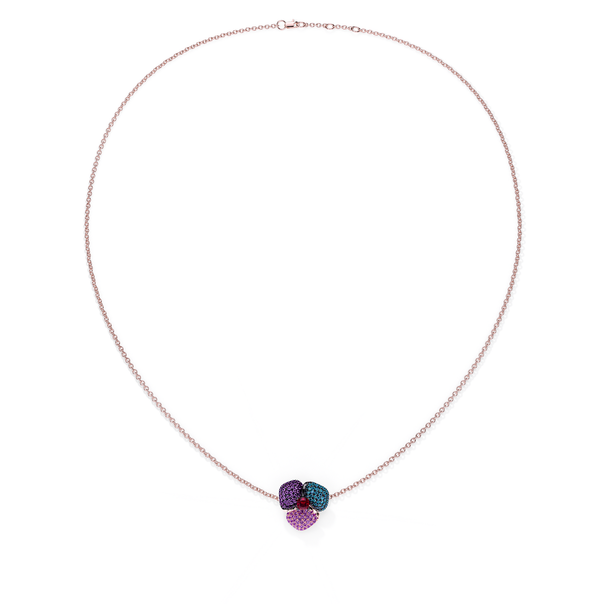 Bloom Small Flower Treated Blue Diamond &Amethyst And Red Gernet Cushion Center In Pink Gold necklace