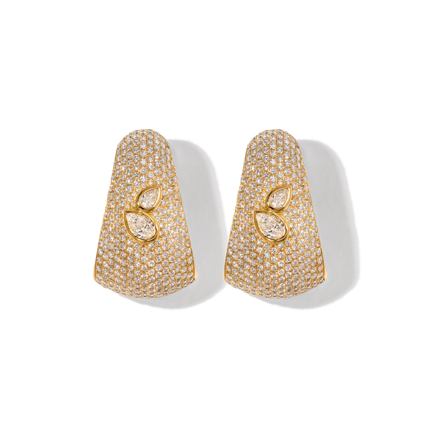 Crafted in 18k yellow gold, these sleek and sexy earrings are encrusted in standout pave diamonds that hug the earlobe. Finished with pear-cut diamond detailing, these earrings are the perfect pair to elevate your next red carpet-look.